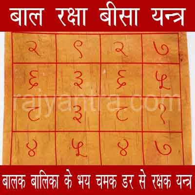 बाल रक्षा बीसा यन्त्र के प्रभाव से बालक, बालिका को भय, चमक, डर आदि उपद्रव नहीं होते है।
